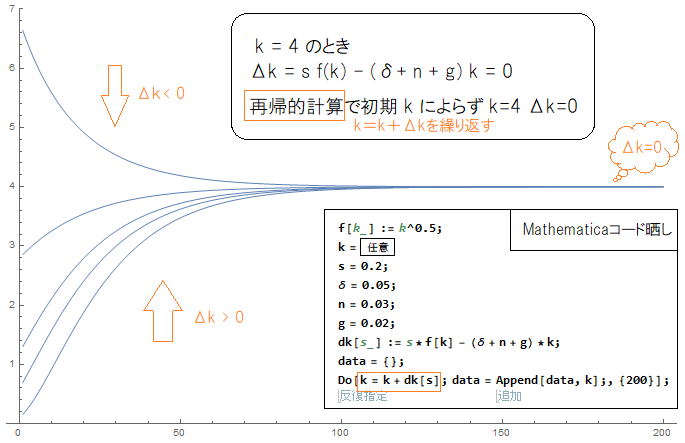 一人あたり資本の定常状態とはなんなのかを端的に示してみた。